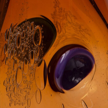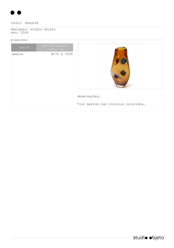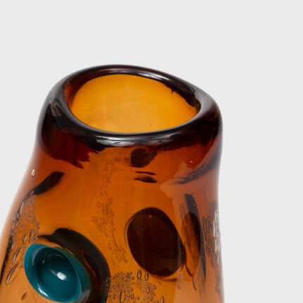 cada vaso amasuk é uma peça única, moldada manualmente em vidro soprado. sua forma orgânica e a transparência em tom âmbar são pontuadas por manchas coloridas, que surgem de um processo artesanal e sempre imprevisível. nenhuma peça é igual à outra — cada uma carrega as marcas da mão que a fez e do instante em que foi criada.