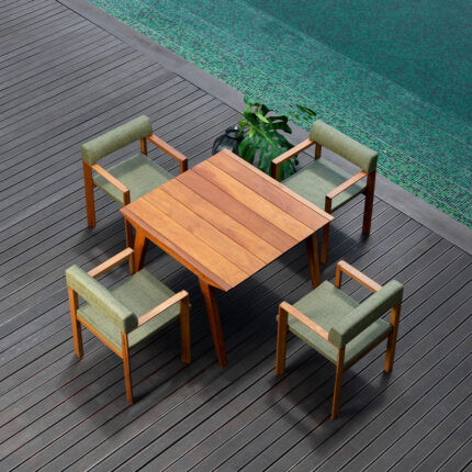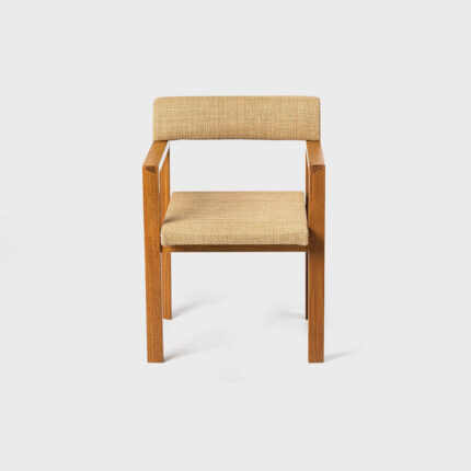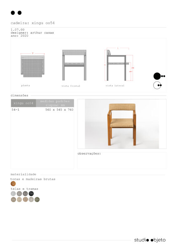 a linha xingu tem desenho retilíneo, fincado na terra. criada para áreas externas, sua estrutura é em madeira tratada e o revestimento usa palha sintética produzida em tear manual e com proteção uv. é uma poltrona generosa em conforto, com encosto e assento com leve inclinação e braços a uma altura agradável.