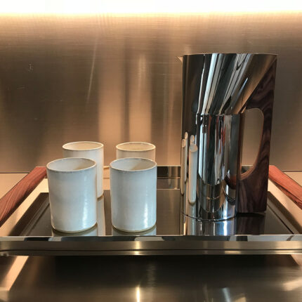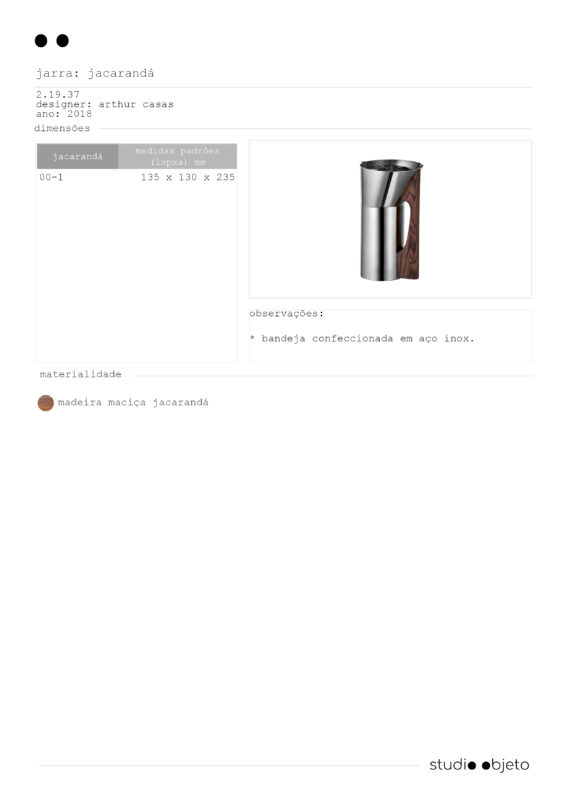 a jarra jacarandá brinca com a relação entre duas formas geométricas: o retângulo e o trapézio, quando vista lateralmente, tanto a alça quanto o bico, ambos trapezoidais, se encaixam no volume retangular, criando uma relação de soma perfeita entre os polígonos, ao mesmo tempo que as angulações necessárias para a eficiência do design. feita em inox e madeira pau-ferro maciça, a jarra comporta 1.5 l de líquido.