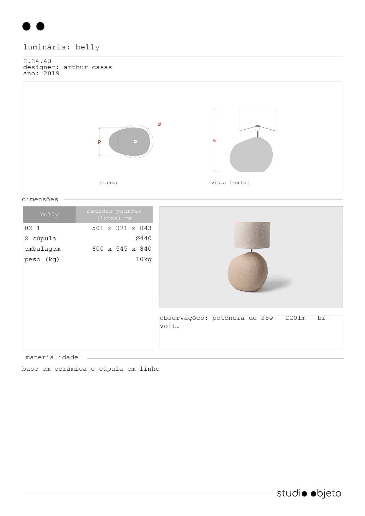 o surgimento do studio objeto está ligado a projetos de arthur casas que não haviam encontrado caminho para sua concretização. essa coleção de luminárias estava há anos na gaveta. nela o arquiteto brinca com formas orgânicas que lembram a de seixos, exagerando em sua expressividade, como se fossem balões inflados assimetricamente. foi desafiador encontrar o parceiro ideal para produzir as bases em cerâmica, tanto pela dimensão das peças quanto pelo tom e textura arenosa específicos. as cúpulas em linho cru completam a originalidade do conjunto.
