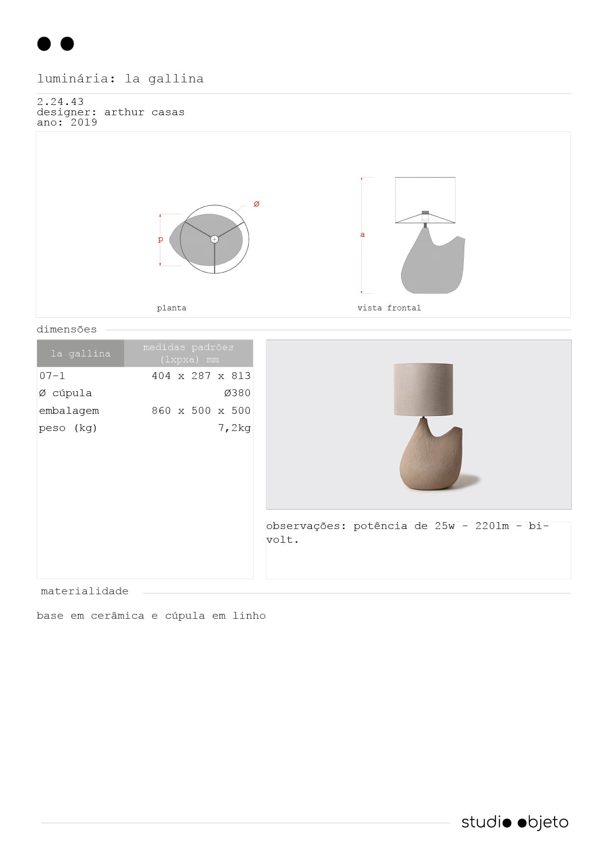 o surgimento do studio objeto está ligado a projetos de arthur casas que não haviam encontrado caminho para sua concretização. essa coleção de luminárias estava há anos na gaveta. nela o arquiteto brinca com formas orgânicas que lembram a de seixos, exagerando em sua expressividade, como se fossem balões inflados assimetricamente. foi desafiador encontrar o parceiro ideal para produzir as bases em cerâmica, tanto pela dimensão das peças quanto pelo tom e textura arenosa específicos. as cúpulas em linho cru completam a originalidade do conjunto.