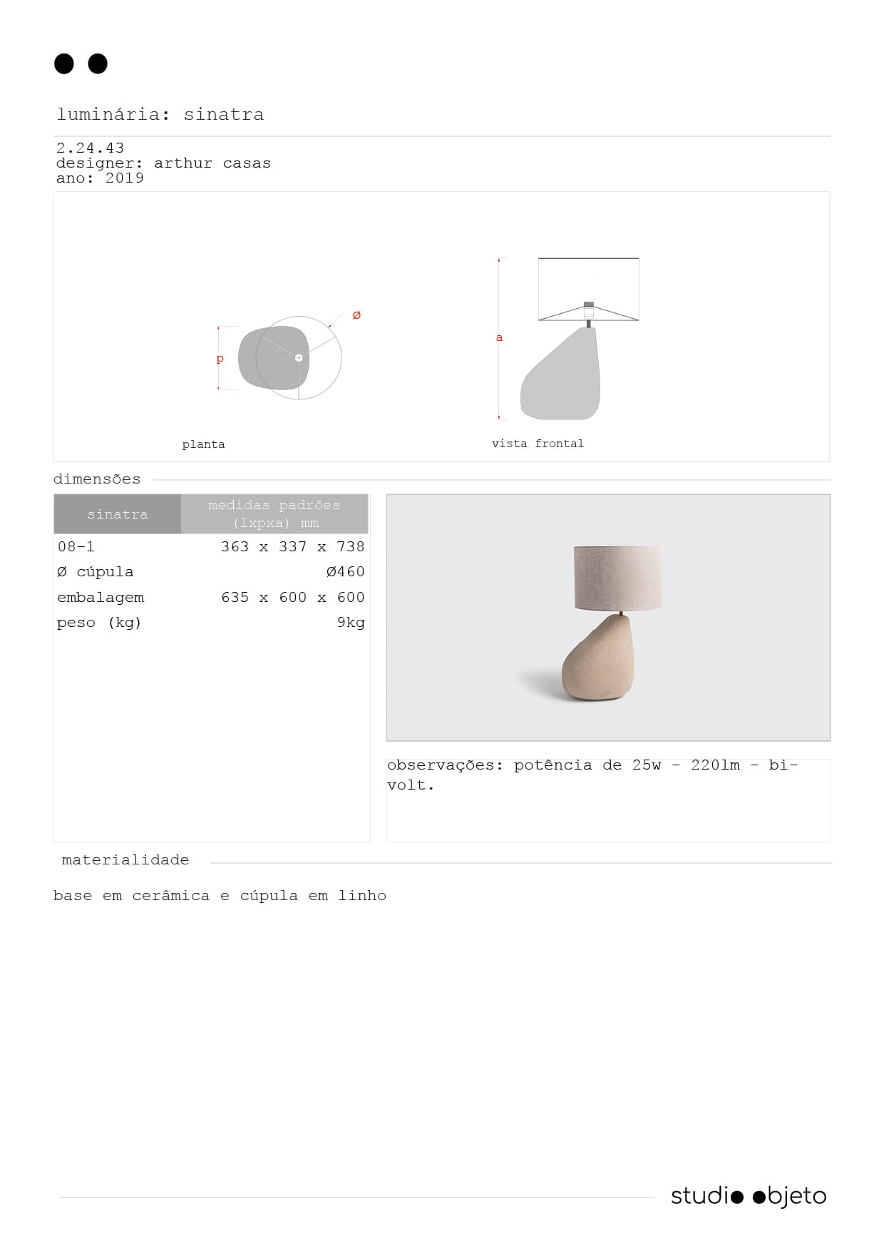 o surgimento do studio objeto está ligado a projetos de arthur casas que não haviam encontrado caminho para sua concretização. essa coleção de luminárias estava há anos na gaveta. nela o arquiteto brinca com formas orgânicas que lembram a de seixos, exagerando em sua expressividade, como se fossem balões inflados assimetricamente. foi desafiador encontrar o parceiro ideal para produzir as bases em cerâmica, tanto pela dimensão das peças quanto pelo tom e textura arenosa específicos. as cúpulas em linho cru completam a originalidade do conjunto.