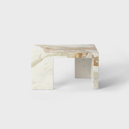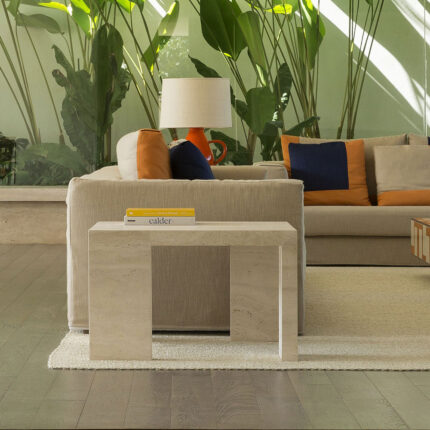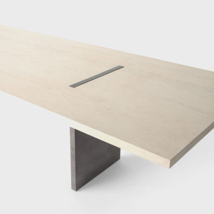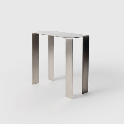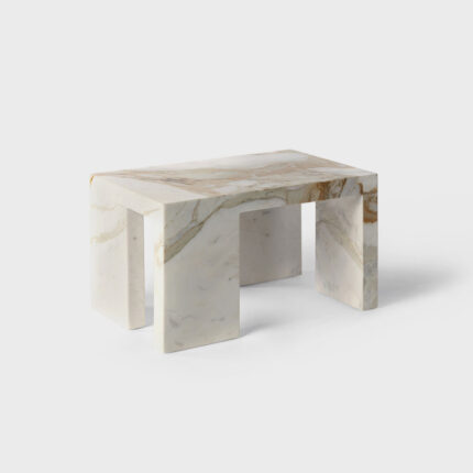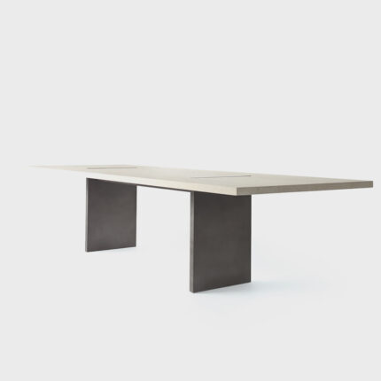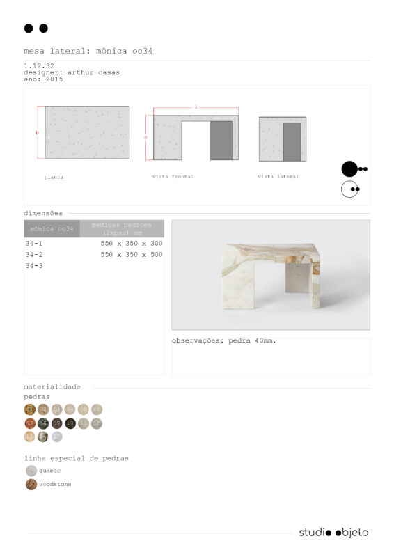 criada para atender um projeto de arquitetura de arthur casas, a mesa mônica tem um desenho que muda sutilmente dependendo do ângulo de observação, com seu jogo entre pés ora paralelos ora perpendiculares, como numa construção com peças de dominó. tampo e pés têm a mesma espessura e tipo de pedra, dando a sensação que a mesa foi esculpida de um só bloco.