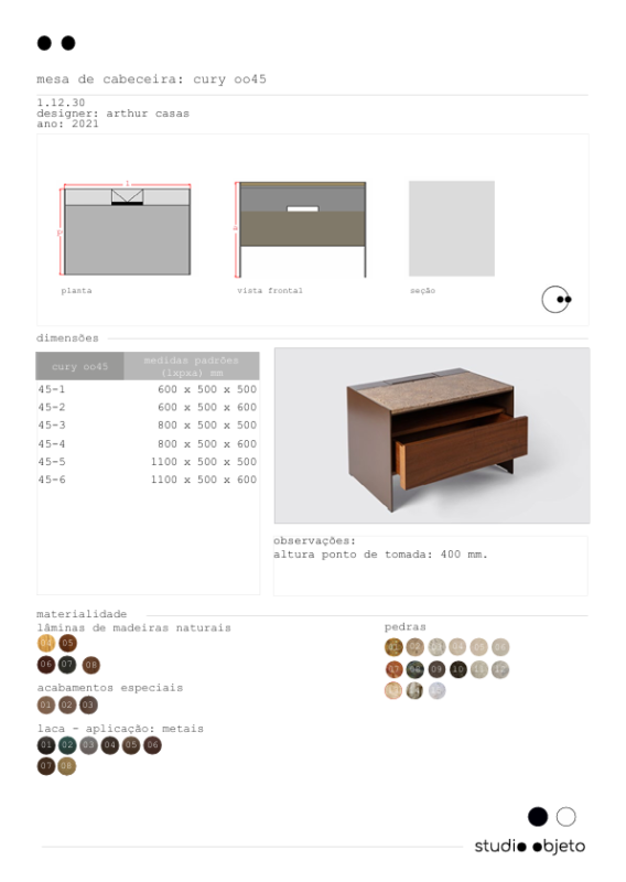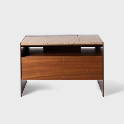 esta peça nasce do mesmo princípio da penteadeira lourdes e da mesa lateral maria: uma mesa de cabeceira elegante e prática. possui tampo, um nicho aberto e uma gaveta, entrada usb e tomadas embutidas. um dos destaques é a espessura fina das laterais, possível pela estrutura de chapa metálica revestida em lâmina de madeiras tratadas que ficam lindas com o mármore noce de cor amendoada.