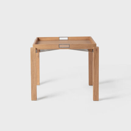 uma mesa simpática e útil. a bandeja deixa a base para buscar o aperitivo e servir quem está longe. feita com madeira tratada e inox, é fácil de mover e pode transitar entre interior e o jardim; chuva e sol não vão deixar marcas. é produzida em diferentes tamanhos e formatos para dar mais liberdade de posicionamento, variando entre mesa de canto, de centro ou de piquenique.