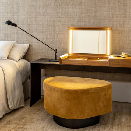 lurdes, ao encomendar uma nova casa ao arquiteto arthur casas, pediu-lhe uma penteadeira sob medida, na qual pudesse se arrumar e guardar maquiagens. o arquiteto desenhou a peça pensando-a como um produto multiuso; todo o conteúdo fica oculto quando a penteadeira não está em uso e ela pode ser também escrivaninha ou mesmo mesa de cabeceira. evoluímos o projeto ao adicionar led, ajuste de altura no espelho, e as indispensáveis tomadas e entrada USB, além de nichos revestidos em camurça, para joias.