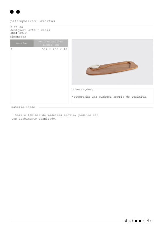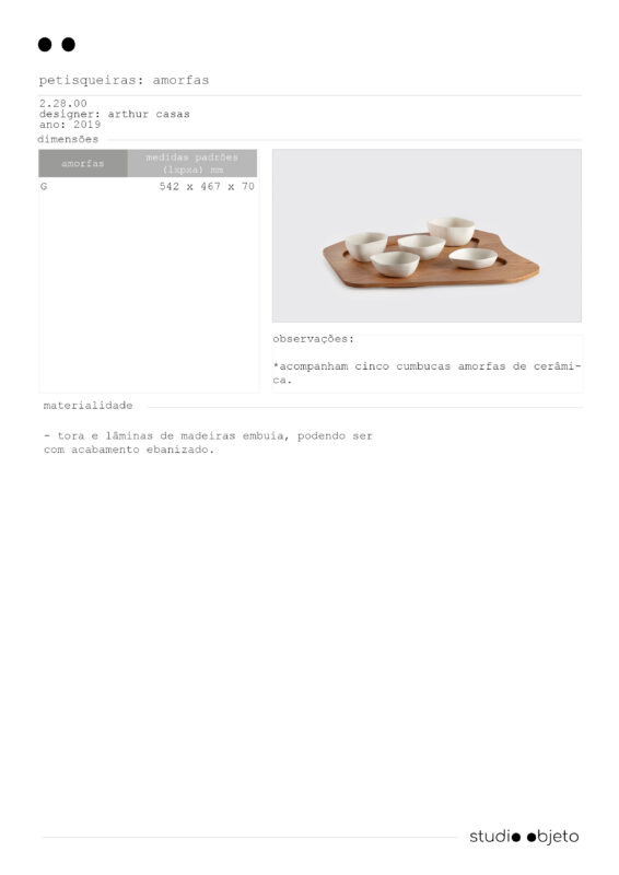 arthur casas tem fascínio por desenhar formas amorfas, aquelas que na natureza não apresentam forma fixa ou estável. são muitas tentativas para alcançar o contorno ideal, como se ele encontrasse o instante perfeito de congelar algo vivo e mutante. a cumbuca faz parte dos produtos gerados a partir dessa pesquisa. Feita artesanalmente em cerâmica de alta temperatura, é um produto delicado e poético. a bandeja que a acompanha é produzida em madeira com tratada, que garante a resistência à umidade.