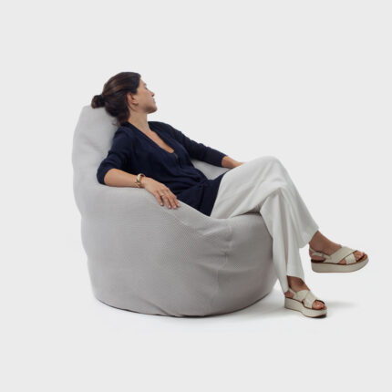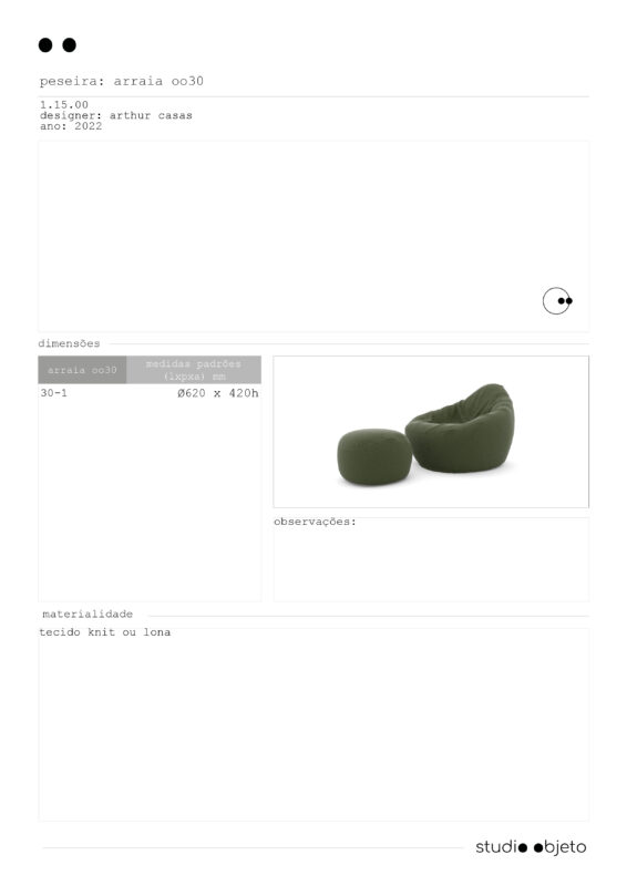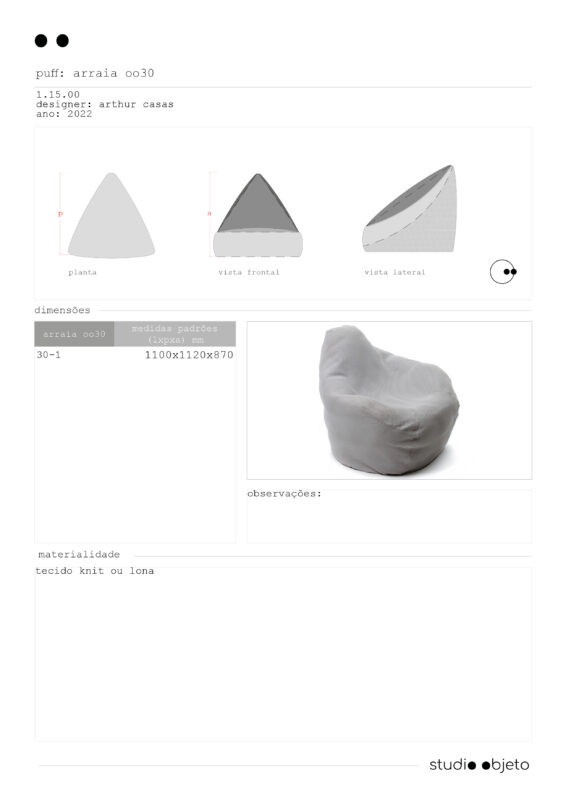 o arraia foi inspirado por um verão na itália e o hábito de algumas pessoas se sentarem em confortáveis pufes colocados na rua – costume que talvez tenha produzido a sacco, poltrona ícone do design italiano. arthur casas repensou sua forma e chegou em um desenho que, visto de cima, lembra uma arraia. o que a diferencia é a possibilidade de se sentar com o encosto ereto e, sobretudo, a sua produção. o nosso principal intuito foi realizá-la da maneira mais tecnológica possível, destinando-a às áreas externas. primeiro, eliminamos a costura ao utilizar crochê tridimensional knit, originalmente desenvolvido para a nike, com proteção UV. no interior, uma espuma leve e 0% absorvente; por não segurar a água ou a umidade, é respirável, anti-fungicida e lavável. assim, a nossa arraia poderia até mesmo viver na água.