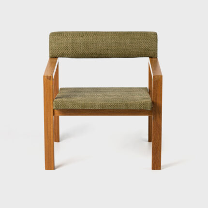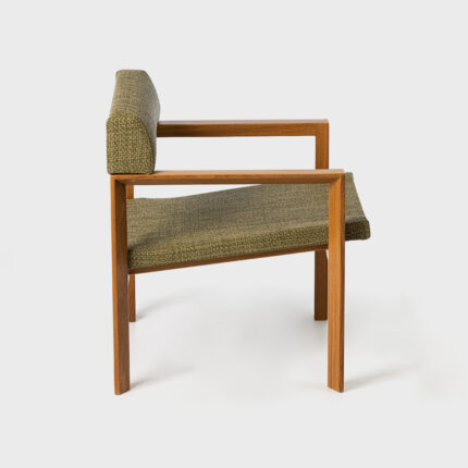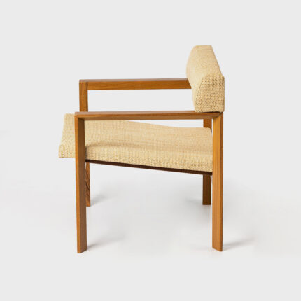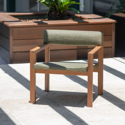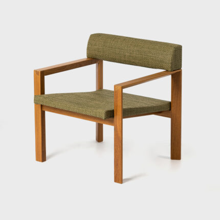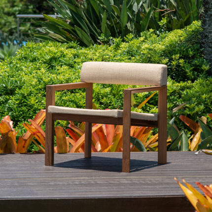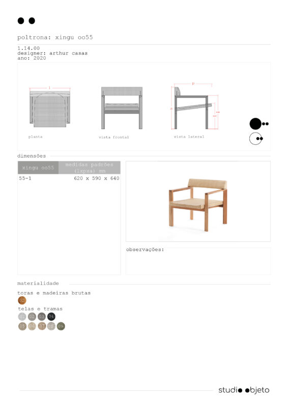 a linha xingu tem desenho retilíneo, fincado na terra. criada para áreas externas, sua estrutura é em madeira tratada e o revestimento usa palha sintética produzida em tear manual e com proteção uv. é uma poltrona generosa em conforto, com encosto e assento com leve inclinação e braços a uma altura agradável.