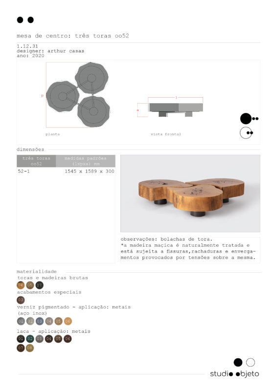 três toras é uma mesa orgânica e única, desenvolvemos a estrutura da base e as toras são escolhidas caso a caso, pela nossa equipe especialmente para o projeto indicado. optamos por toras de pequiá, arvore amazônica que chega a ter o diâmetro de até dois metros, a nossa escolha por essa espécie vem, além da sua beleza, a resistência dela ao ataque de fungos e cupins. a três toras trás um pouco da floresta para o ambiente.