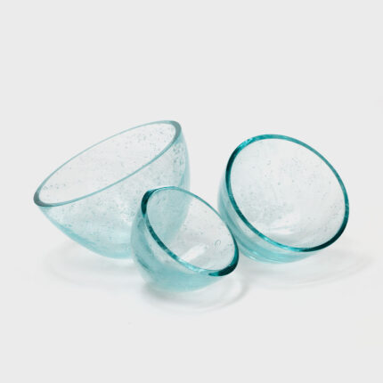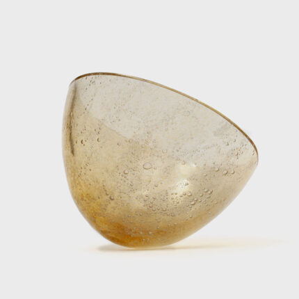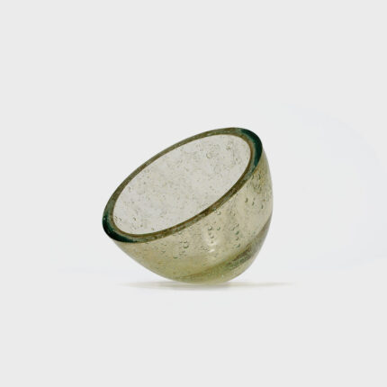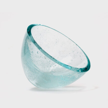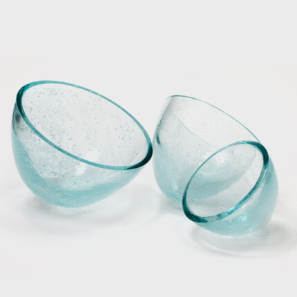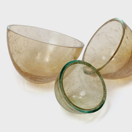 moldados no calor dos fornos em gramado (RS), os vasos bambos têm formas livres e instáveis, que oscilam com leveza — como se flutuassem sobre a superfície. podem ser usados como peças decorativas, como centro de mesa, ou de forma utilitária: para servir saladas, sopas ou frutas, com o uso de um anel metálico que estabiliza seu balanço.